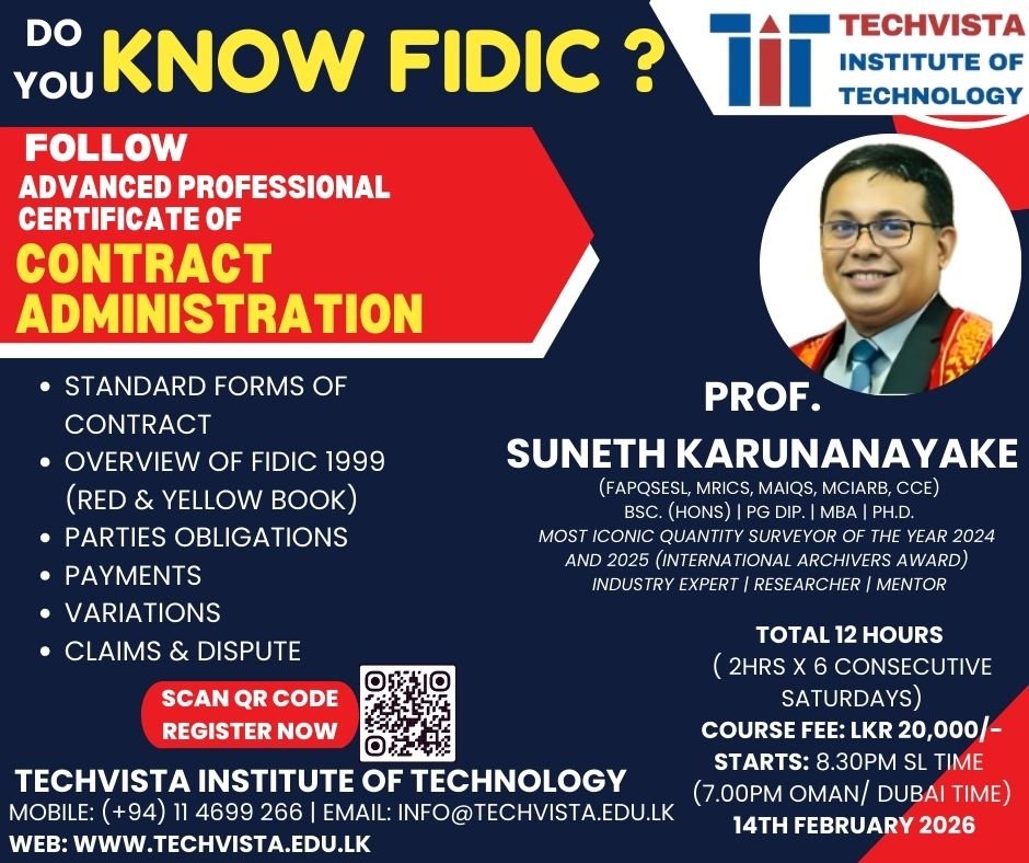 Specialize in the critical aspects of contract handling with in-depth training on the FIDIC 1999 Red Book, Harmonized Editions, and National Procurement Guidelines of Sri Lanka.